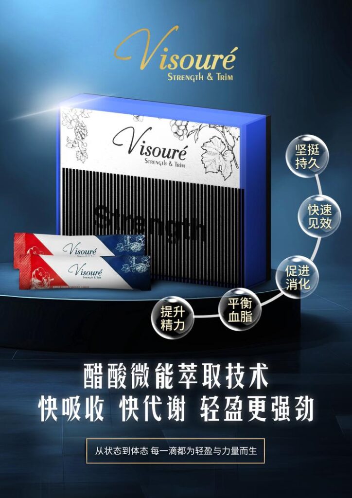Visoure是一款专为男性设计的轻养调理饮,融合巴萨米克醋、刺五加与朱丽叶苹果醋三大核心成分,从「心血管、抗压、代谢」三大男性核心问题出发,有效降低胆固醇、稳定血糖、促进消化与体能恢复。帮助男性在高压生活中维持健康平衡与持久活力。